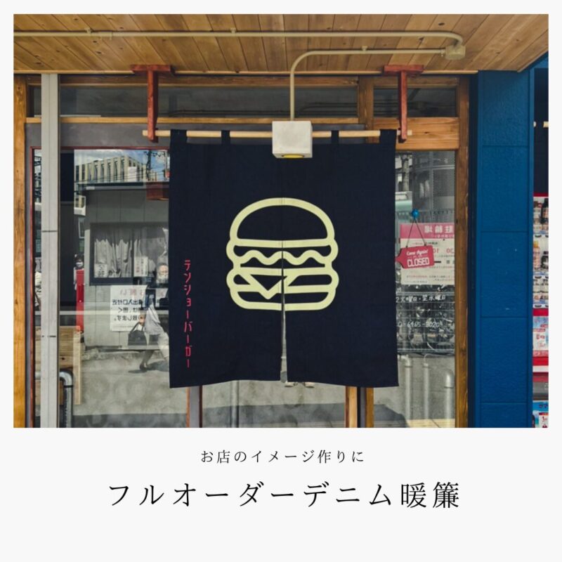 京都デニムの暖簾オーダー制作は、お客様の目的に合わせて自由自在に形・サイズ・生地・柄すべてをお選びいただけます。